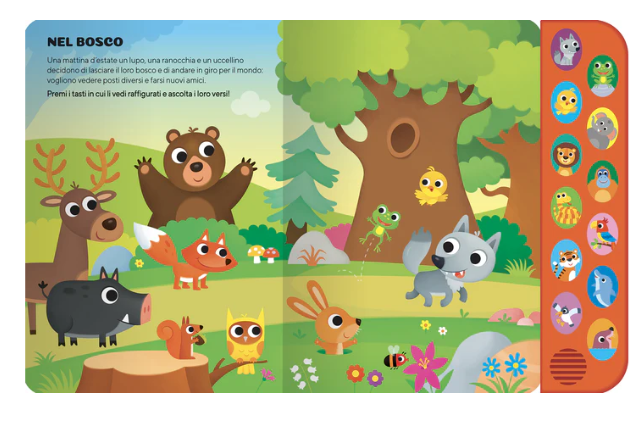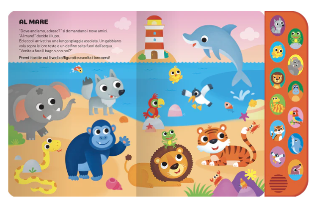 Un libro sugli animali in cui i bambini sono invitati a cercare gli elementi all’interno delle illustrazioni e a premere i tasti corrispondenti per scoprire i dodici suoni presenti. Un libro interattivo e multisensoriale, con testi semplici perfetti per imparare parole nuove, e bellissime illustrazioni per sorprendersi pagina dopo pagina.