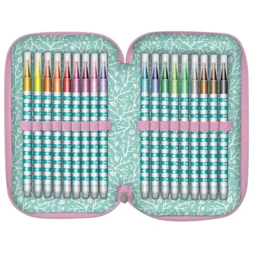 Riempito con 45 pezzi di accessori: pennarelli in 18 colori, pastelli 18 in colori, matita di grafite HB, temperino, gomma, righello da 15 cm, squadra, goniometro, 3 penne a sfera, (nera, rossa e blu).