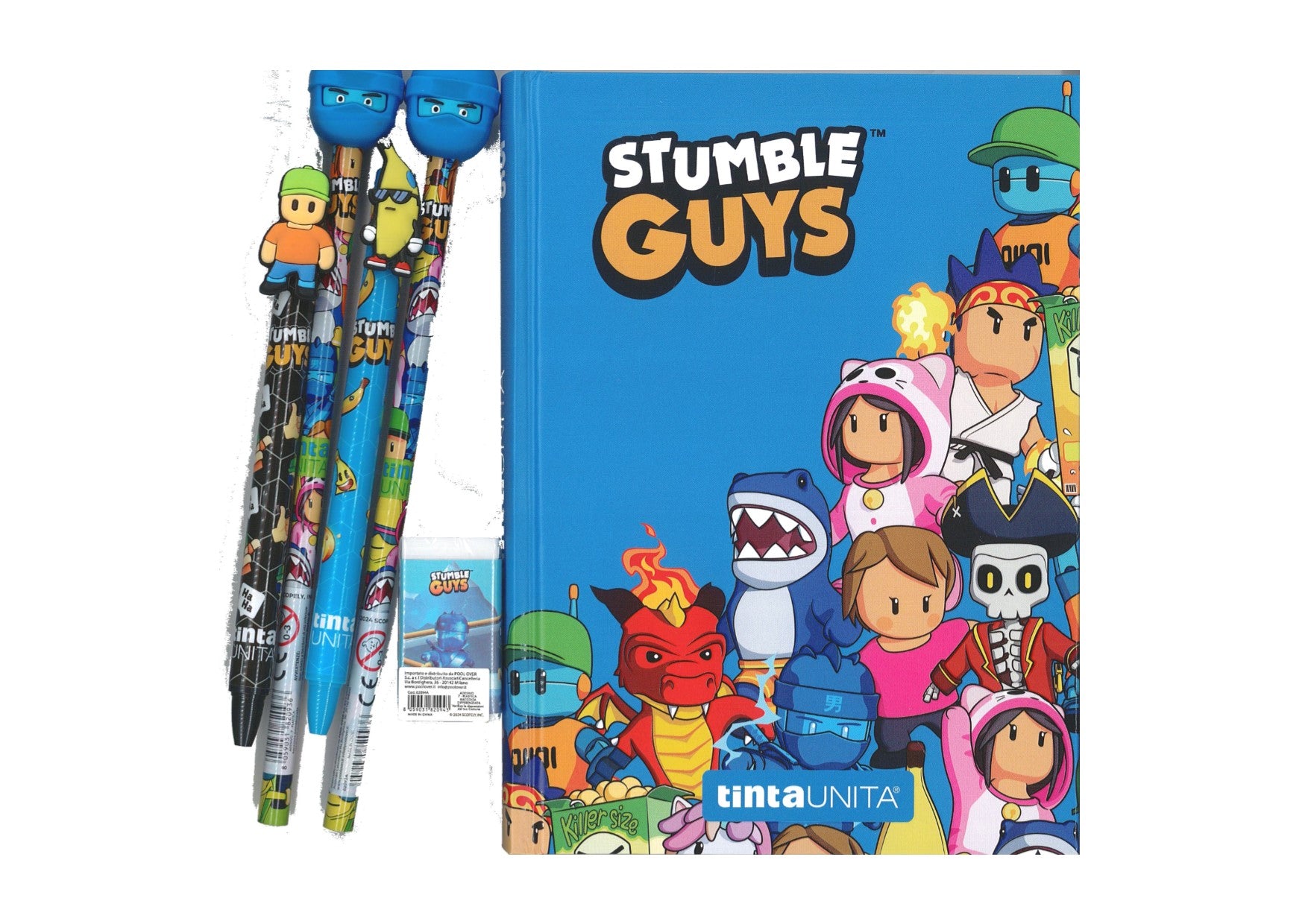 La copertina rigida trasparente è decorata con i personaggi iconici di Stumble Guys e custodisce un set di accessori esclusivi:2 matite Stumble Guys,2 penne a sfera e 1 gomma personalizzata.