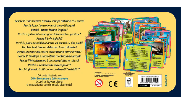 Uno speciale cofanetto che racchiude 200 domande e 200 risposte su diversi ambiti del sapere: dinosauri, animali, natura, pianeta Terra, universo, popoli antichi, luoghi del mondo, luoghi d'Italia, scienze e invenzioni, scoperte. Su queste carte troverai tante risposte a ogni domanda, ma solo una è quella giusta. Fai la tua scelta, poi gira la carta e controlla se hai indovinato!