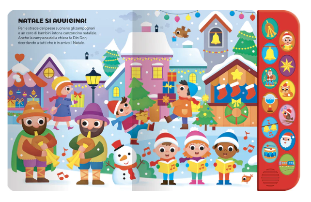 Un libro sonoro per gustare tutta la magia della festa più attesa: bambine e bambini sono invitati a osservare gli elementi natalizi all’interno delle illustrazioni e a premere i tasti corrispondenti per scoprire i dodici suoni presenti. Un libro interattivo e multisensoriale, con testi semplici perfetti per imparare parole nuove, e coloratissime illustrazioni per sorprendersi pagina dopo pagina.