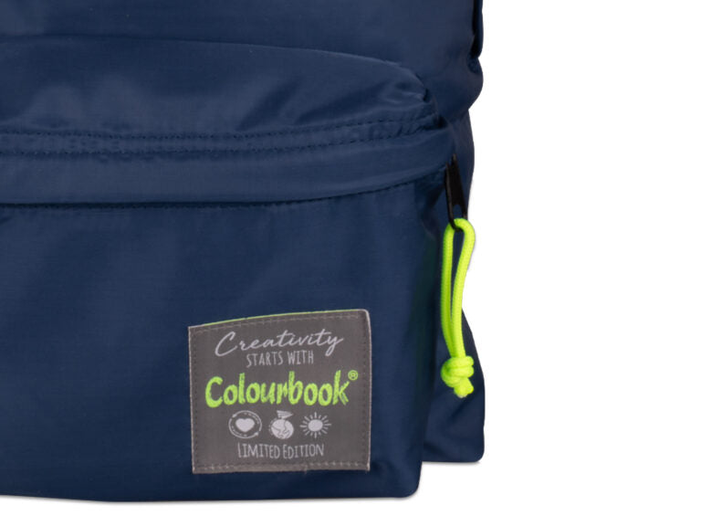 Il design minimalista è arricchito dai dettagli giallo fluo, come il cordoncino tirazip della tasca principale e della pratica tasca anteriore, su cui è riportata anche l’etichetta “Colourbook Limited Edition”.