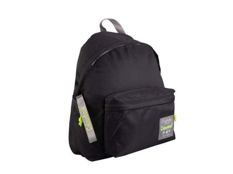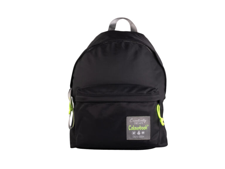 Il design minimalista è arricchito dai dettagli giallo fluo, come il cordoncino tirazip della tasca principale e della pratica tasca anteriore, su cui è riportata anche l’etichetta “Colourbook Limited Edition”.